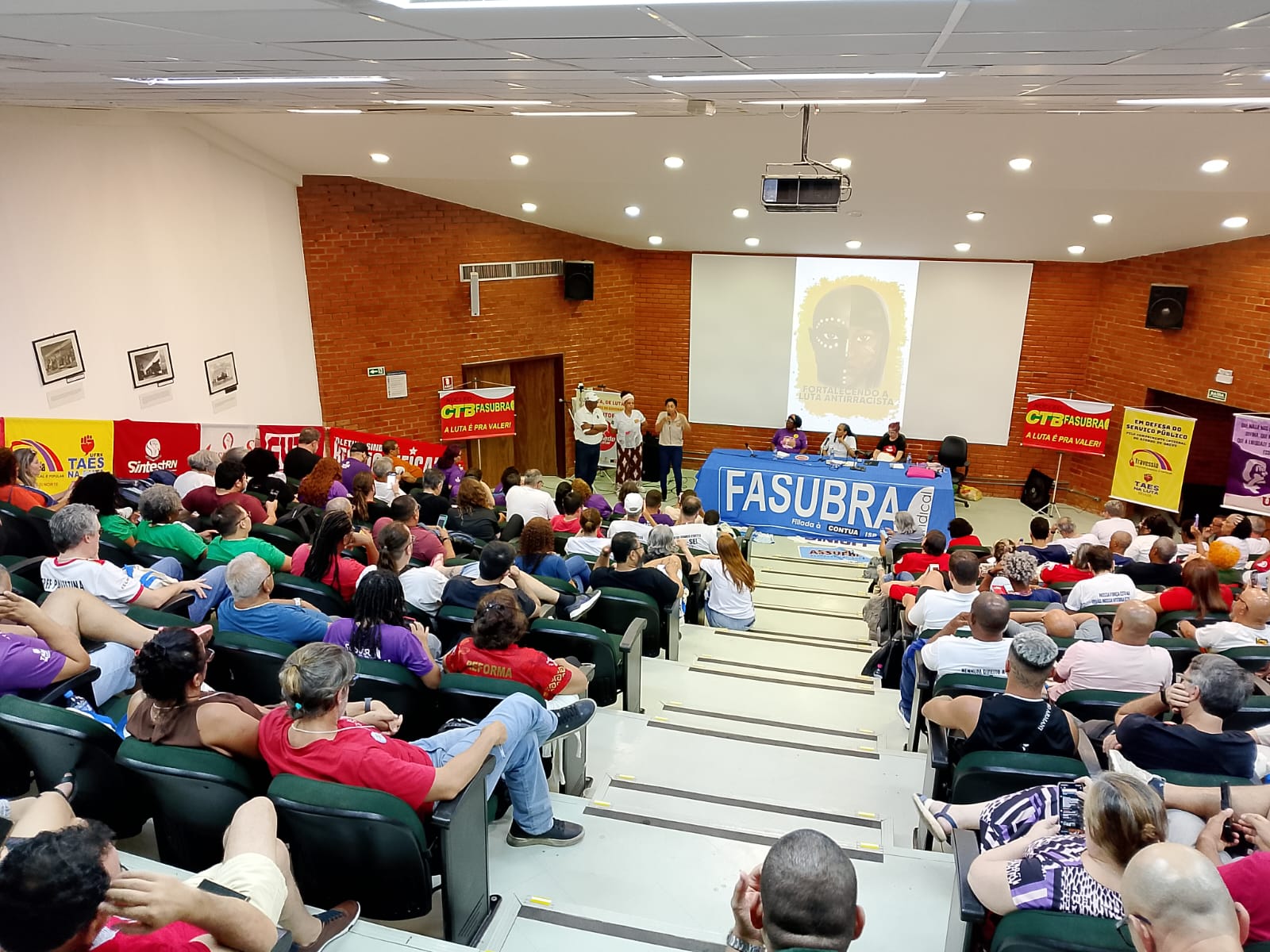 O encontro contou com a participação de representantes de movimentos sindicais e a FASUBRA Sindical marcou presença através das coordenadoras: Maria Tereza Tavares Fujii (Coordenação de Aposentados), Ana Cristina Carvalho Miranda (Direção Nacional), Elma Dutra (Direção Nacional) e Maria Thereza Rodrigues Silveira (Direção Nacional).