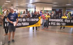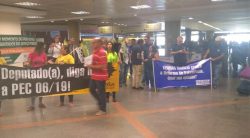 Nesta terça-feira (2), os técnico-administrativos e técnica-administrativas em educação participaram de ação no Aeroporto Internacional de Brasília recepcionando e cobrando dos parlamentares que desembarcaram na capital o posicionamento contrário à medida. A FASUBRA Sindical conclama as entidades de base a incorporarem à luta, realizando panfletagens nos aeroportos e a recepção dos parlamentares em seus estados.